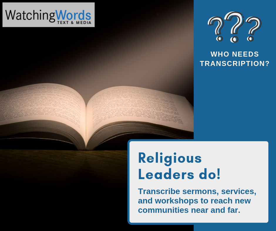 Transcribing your sermons, services, and events allows your church, synagogue, or mosque to maintain a closer relationship with your existing members, help shut-ins stay connected to your faith community, and reach out to new communities near and far.
